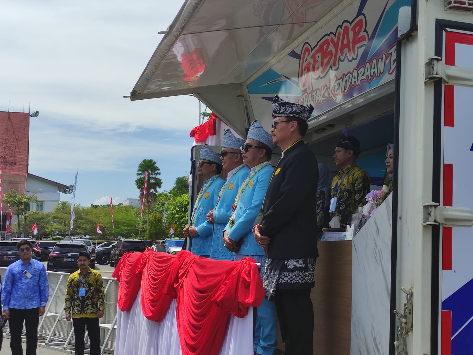 Gubernur Kalimantan Selatan, H Muhidin didampingi Wakil Gubernur Kalimantan Selatan Hasnuryadi Sulaiman dan Sekretaris Daerah Provinsi Kalimantan Selatan, M Syarifuddin melakukan peluncuran Gebyar Panutan Pajak di Area Mobil Pelayanan yang terparkir di sekitar panggung utama peringatan Hari Jadi ke-75 Provinsi Kalimantan Selatan.