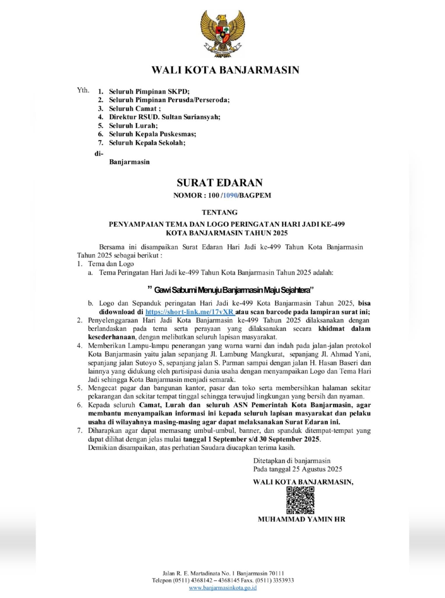 KabarKalimantan, Banjarmasin – Menjelang Puncak Peringatan Hari Jadi Kota Banjarmasin ke 499 yang jatuh pada tanggal 24 September 2025, Pemerintah Kota mengeluarkan Surat Edaran Nomor : 100 /1090/BAGPEM tentang Penyampaian Tema dan Logo Peringatan Hari Jadi ke-499 Kota Banjarmasin Tahun 2025.