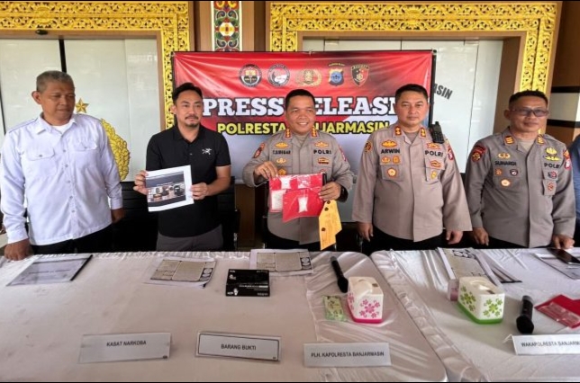 Pengungkapan kasus Narkotika tersebut disampaikan langsung Plh Kapolresta Banjarmasin, Kombes Pol Timbul Siregar didampingi Wakapolresta, AKBP Arwin Amrih Wintama, serta jajaran Pejabat Utama (PJU) kepada awak media, Kamis (23/4/2026).