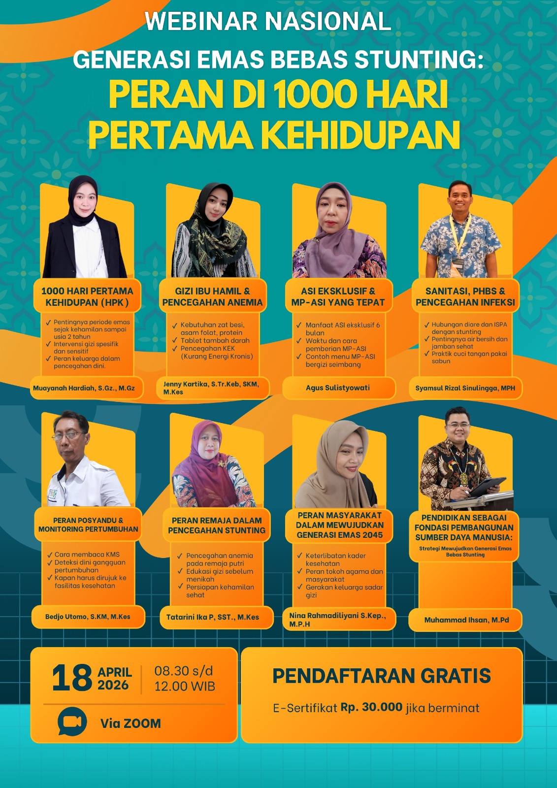 Dosen yang mewakili UNIVSM yakni Muayanah Hardiah, S.Gz., M.Gz., selaku Kaprodi D3 Gizi Fakultas Kesehatan, serta Muhammad Ihsan, M.Pd., dosen FKIP Program Studi S1 PGSD. Keduanya tergabung bersama para pemateri dari berbagai latar belakang, mulai dari bidang kesehatan, pendidikan, hingga pemberdayaan masyarakat.