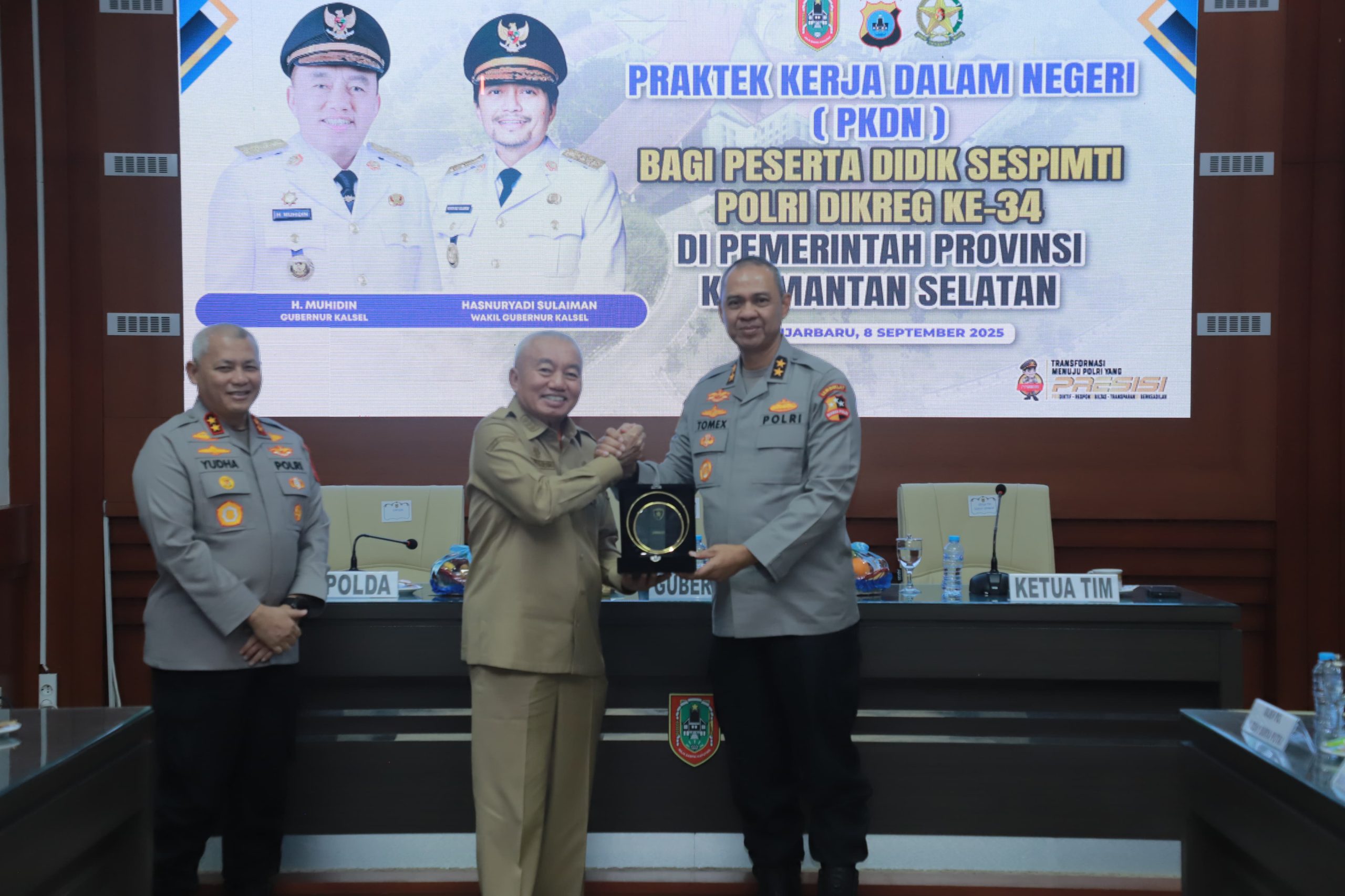 KabarKalimantan, Banjarbaru – Gubernur Kalimantan Selatan H. Muhidin menerima rombongan Praktek Kerja Dalam Negeri (PKDN) Peserta Didik Sekolah Staf dan Pimpinan Lembaga Pendidikan dan Pelatihan (Sespimti) Polri Dikreg ke-34 di Pemerintah Provinsi Kalsel, Senin (8/9/2025), di ruang PM Noor lantai 4 Kantor Gubernur di Banjarbaru.
