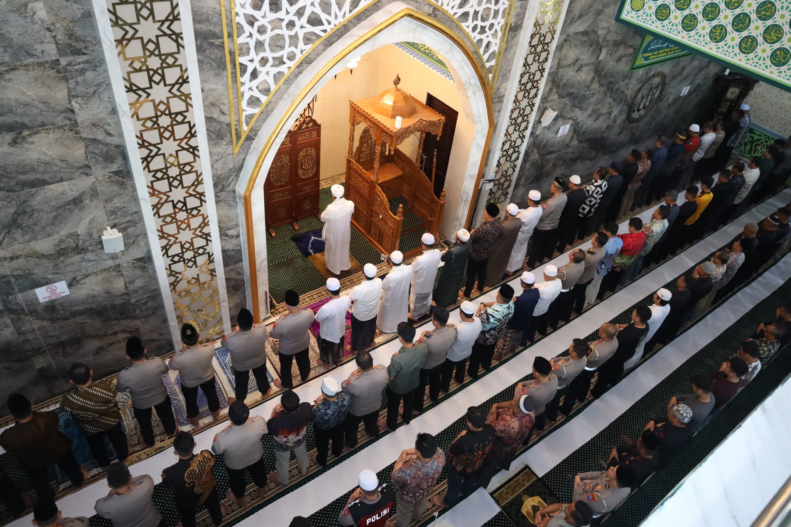 Shalat ghaib dilaksanakan di Masjid Riyadus Shalihin Polda Kalsel, Banjarbaru, Jumat (29/8/2025), seusai pelaksanaan shalat Jumat yang dihadiri oleh Kapolda Kalsel, Irwasda Polda Kalsel, Pejabat Utama Polda Kalsel, personel Polri dan ASN Polda Kalsel.